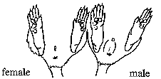 When baby rats are a mere five weeks old, they are ready to reproduce. Therefore, males should be separated from the litter as soon as they are weaned from the mother (about five weeks of age), and should be kept separated from the females at all times. This will prevent the accidental pregnancies (which seems to occur at an alarming rate in pet shops). Many of these young rats are far too young and underdeveloped to healthily support an unborn litter, as they are not yet full-grown themselves. Likewise, the mother is far too weak to support an unborn litter so soon after weaning the previous litter, should one of her sons get her pregnant. Separating a litter by gender after weaning is in the best interest of the health of these young rats and their mother. Once rats reach 3 weeks of age, it should be pretty obvious which are male and which are female (though it can be determined sooner, with experience). The males' testicles will be visible -- though they can pull them inside at will, especially if they are nervous or frightened. Females should have visible nipples on their bellies. The best thing to do is compare a few until you find two that are different, and then it will be easy to tell who is what. The diagram below should help.